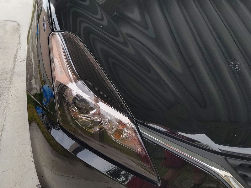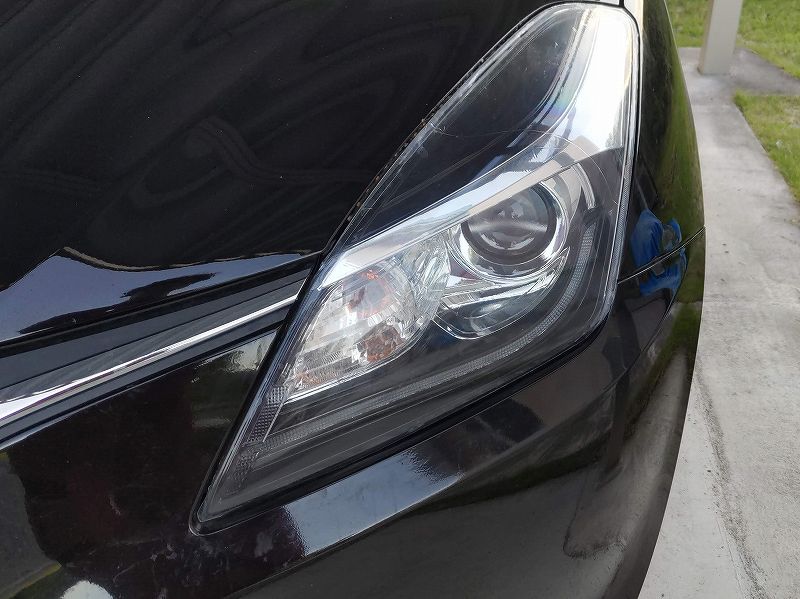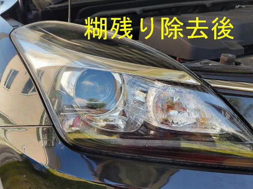 保護フィルムというは、基材と粘着材からできてます。基材がフィルムで、粘着材が糊です。今回フィルムを剥がすことで、基材から糊が剥がれて、ヘッドライトの方に付着してしまってます。 粘着材も、基材も、厚さは20〜60μmぐらいの筈なので、研磨で落とすのは、愚の骨頂です。ヘッドライトまで削ることになり本望ではないです。 ということで、無水エタノールで、粘着剤を溶かしながら除去しました。 糊残り除去後