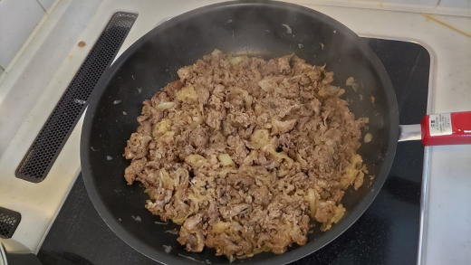 下の写真は、肉が焼けて、玉ねぎを再投入おわったところ