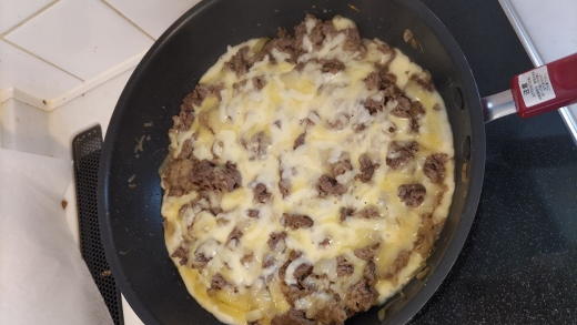 牛肉のスライスを、さらにちっさく切っておいて、塩・コショウで下味をつけて炒める。(米国では、鉄板で焼いて、焼きあがったところで、お好み焼きのヘラみたいなんで、ちっさくしてたけど、フッ素コートのフライパンでは、それはできんので、最初にちっさくしておく)