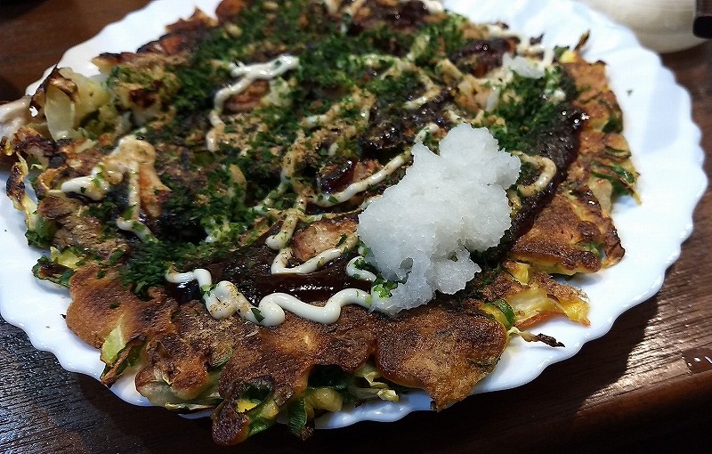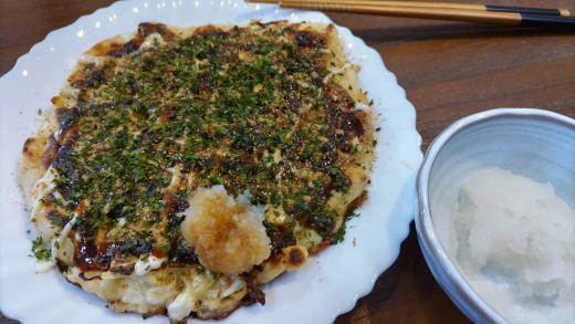 ・お好み焼きが焼けたら、普段通り、ソース・マヨネーズかけて、刻みのり、削り粉をふりかけます。