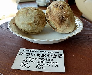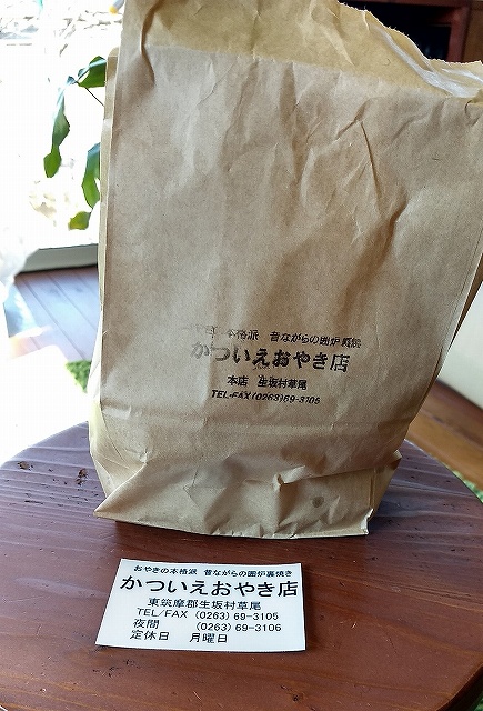 こちらのおやきは、『灰焼き』です。 おやきの中では、古典ですかね!? 最近は、灰焼きのお店が減ってしまいましたが、生坂村には、「かあさん家」 と こちらの 「かついえ」 が、2大巨頭として残っています。予約をしないと、買えないことが多いという前評判でしたので、予約はせずに開店と同時にお店に入りました。結果、2番目に購入することができまして、自分の次に来た人は、午後まで買えないと言われてました。