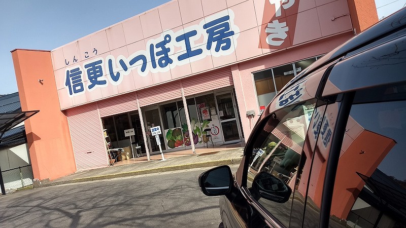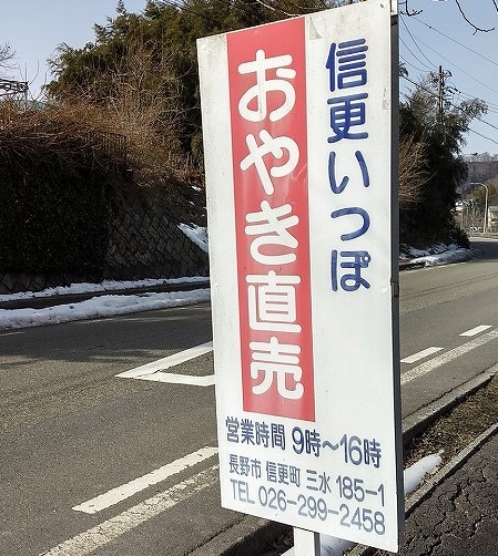 長野市から安曇野市に向かう国道19号は、信号の少ないドライブ街道で、犀川沿いの景色を眺めていると、あっという間に抜けてしまう道である。 (1時間ぐらいで、長野市〜安曇野市まで来ますね。途中、ジンギスカン街道の"のぼり"が気になるぐらいです。) そんな、なんも無いような道に、実は、昔ながらのおやきを販売する店があります。 それが、『信更いっぽ』さんです。