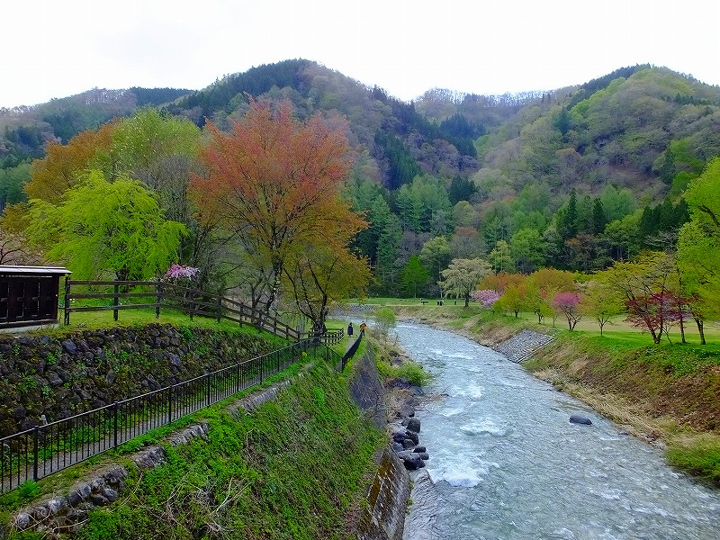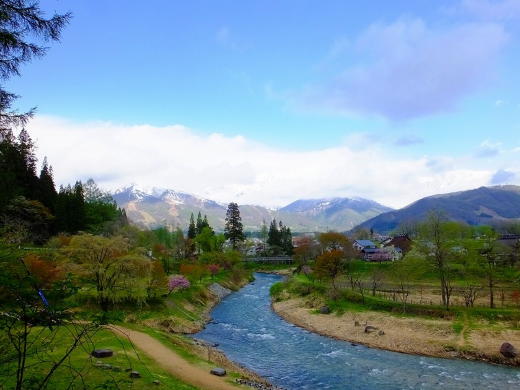 GW前ぐらいだと、桜+雪に覆われた北アルプス+新緑の河川敷