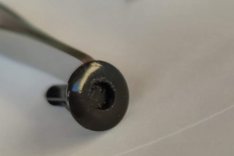 下の写真は、プッシュピンをピンを押した状態。 (傷だらけにしてしまったのは、プルしようと思って、先の尖った工具で突きまわした結果です。最初からプッシュ式と分かっていれば、こんなことはしませんでした・・・。反省中です。)