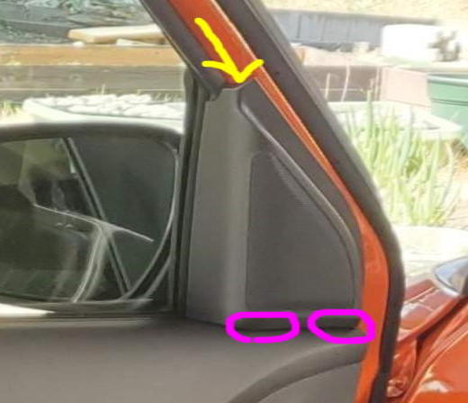 黄色の矢印の隙間から、内張り剥がしグッズをいれて剥がします。 下のピンクの丸のところは、フック状になっていて、上から中を覗き込むと、フックの引っ掛かりが見れるので、マイナスドライバーで押してあげると簡単にとれます。変な力を入れて、力ずくで外すと、フックが変形してしまうので要注意です。